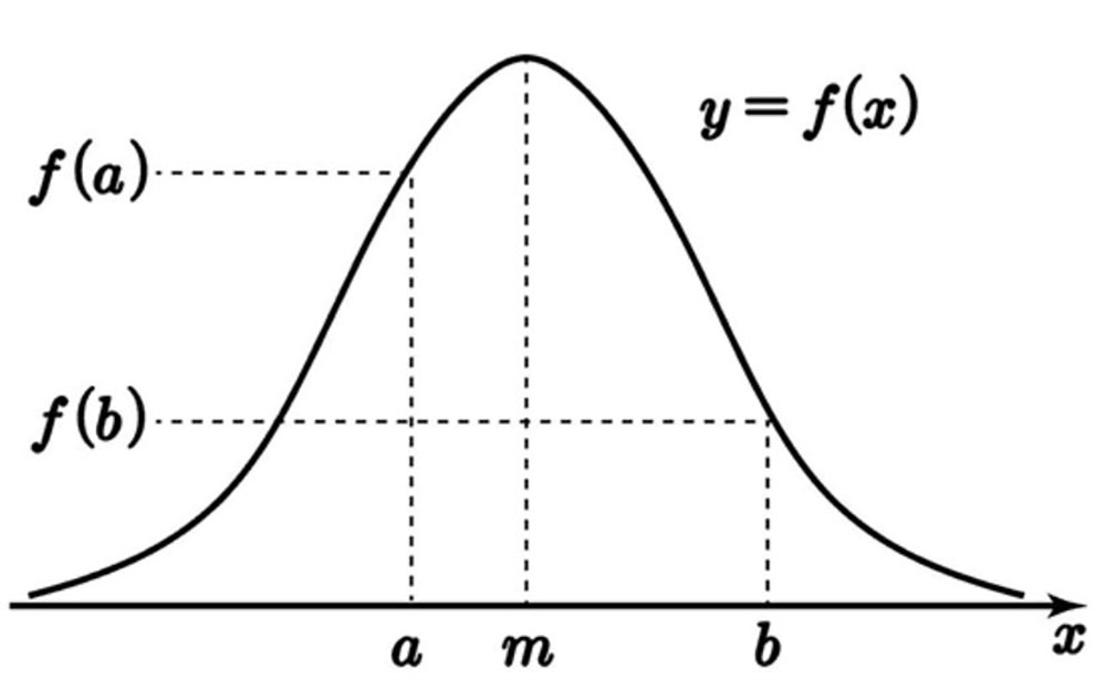$$\left | \,m-a \, \right | < \left |\, m-b \,\right | \; \Rightarrow \; f(a) >f(b)$$ $$\left | \,m-a \, \right | = \left |\, m-b \,\right | \; \Rightarrow \; f(a) =f(b)$$ $$\left | \,m-a \, \right | > \left |\, m-b \,\right | \; \Rightarrow \; f(a) <f(b)$$가 성립한다.