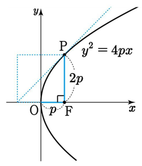 포물선의 초점 $\textrm{F} (p, 0)$에서 점 $\textrm{P}$의 $y$좌표를 구하면