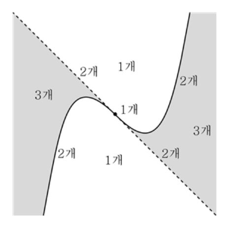 따라서 삼차함수위의 점인 아닌 변곡접선 위의 임의의 한 점에서 삼차함수에 그은 접선이 개수는 2개가 된다.
