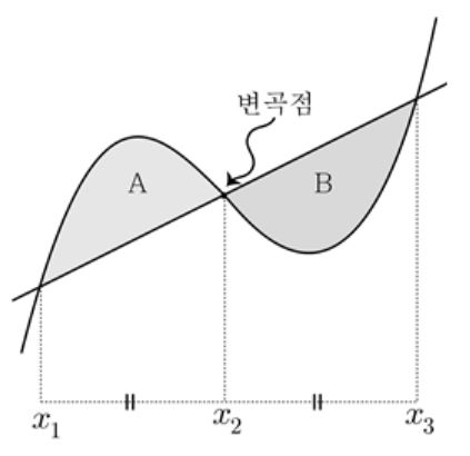 따라서 삼차함수와 변곡점을 지나는 직선에 의해 생기는 두 영역의 넓이는 같다.