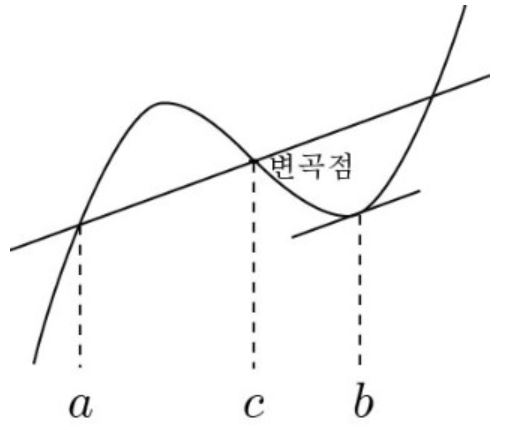 | 7. 변곡점을 지나가는 직선과 삼차함수로 둘러싸인 두 영역의 넓이는 서로 같다. |