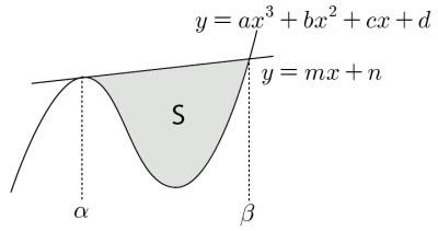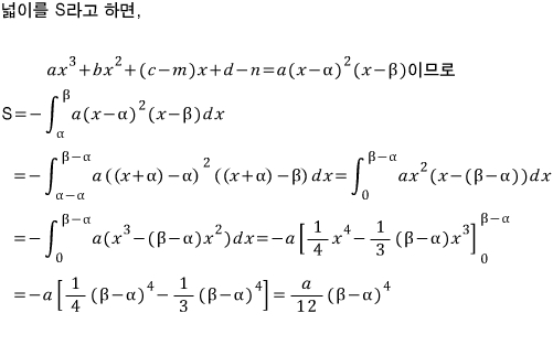 삼차함수와 접선으로 둘러싸인 영역의 넓이 공식을 유도하는 과정이다. 공식도 기억하고 증명과정도 주목하기 바란다. 정적분의 평행이동을 연습할 수 있는 좋은 예제가 된다.
