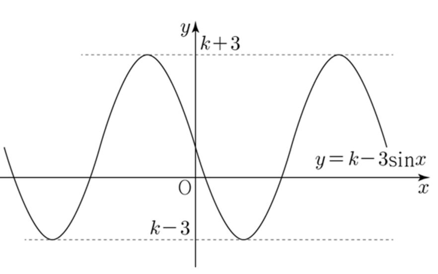 [solve] $f'(x)= k-3\sin x$ 에서 $y=-3\sin x +k$의 그래프가 $x$ 축을 뚫으면 된다.
