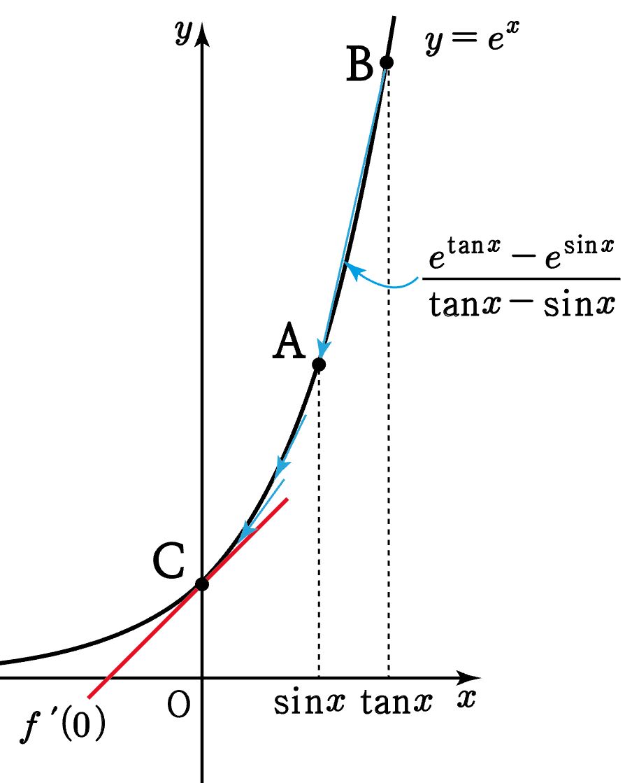 $\displaystyle\frac{e^{\tan x}-e^{\sin x}}{\tan x- \sin x}$ 는 직선 $\rm {AB}$의 기울기가 나타낸다.