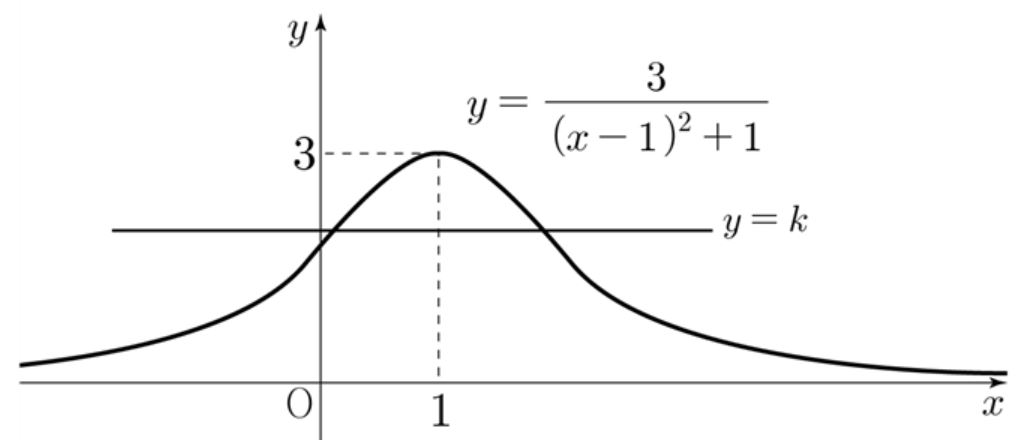 방정식 $\displaystyle\frac{3}{x^2 -2x +2}=k$ 가 서로 다른 두 실근을 가질 때, 실수 $k$ 값의 범위는? |