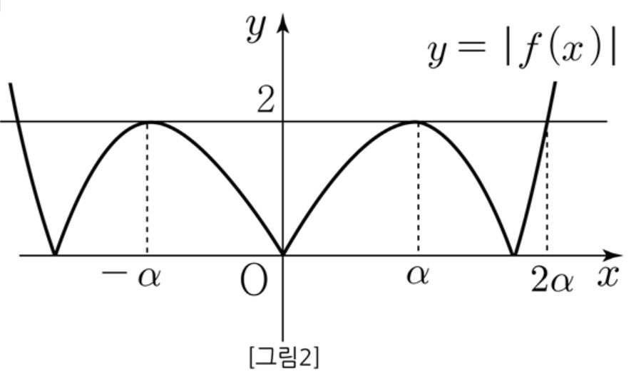 $f(x)$ 는 기함수이므로 원정대칭이다. $x=\alpha$ 에서 극댓값을 갖는다고 하면 [그림2]에서 방정식 $ \left | f(x) \right | =2 $ 가 서로 다른 실근의 개수가 $4$가 된다.