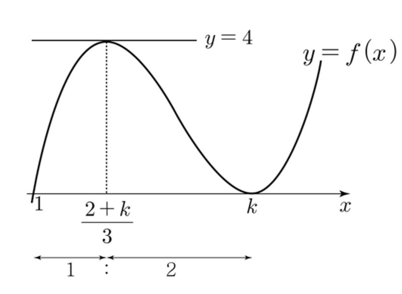 $f \left (\displaystyle\frac{2+k}{3} \right )=\displaystyle\frac{4}{27}(k-1)^3 =4$ 에서