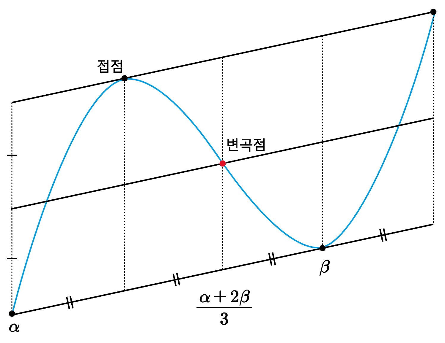삼차함수는 변곡점에 대한 대칭이고 위의 그림과 같은 비율 관계가 성립한다. 증명은 이전 글을 참고하세요.