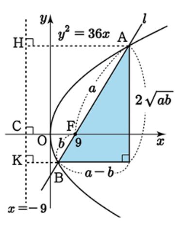 포물선 $y^2 =36x$ 의 초점 F를 지나는 직선 $l$ 이 포물선과 만나는 서로 다른 두 점을 각각 A, B 라 하고 두점 A, B에서 포물선의 준선에 내린 수선의 발을 각각 H, K라 하자. $ \rm \overline{AH} + \overline{BK}=45$ 일 때, 직선 $l$의 기울기를 구하여라. (단, $\rm \overline{AF}>\overline{BF}$ ) ![]() |