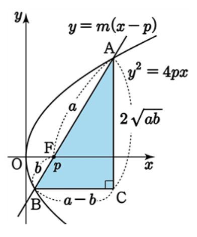 포물선 $y^2 = 4px $ 에서 초점 F를 지나는 직선이 포물선과 만나는 두 점을 A, B라 하면 기울기가 $m$ 인 직선의 방정식은 $y=m(x-p)$ 이다.
