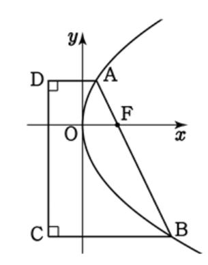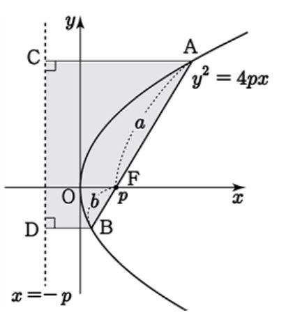 포물선 $y^2 = 4px$ 에서 초점 F를 지나는 직선이 포물선과 만나는 두 점을 A, B라 하고 두 점 A, B에서 준선 $x=-p$ 에 내린 수선의 발을 각각 C, D라 하자.