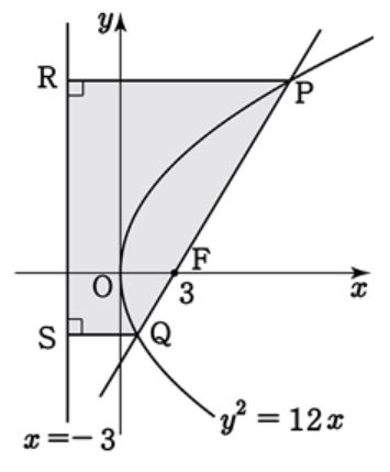 그림과 같이 포물선 $y^2 =12x$ 와 점 F$(3, 0)$ 을 지나는 직선이 서로 다른 두 점 P, Q에서 만난다. 두 점 P, Q에서 직선 $x=-3$ 에 내린 수선의 발을 각각 R, S라 하고 $\rm \overline{PF}=12$ 일 때 사다리꼴 PRSQ의 넓이는? ![]() |