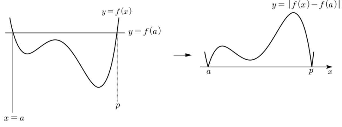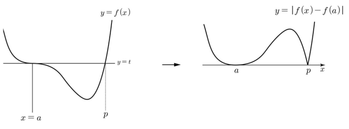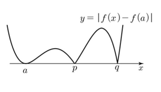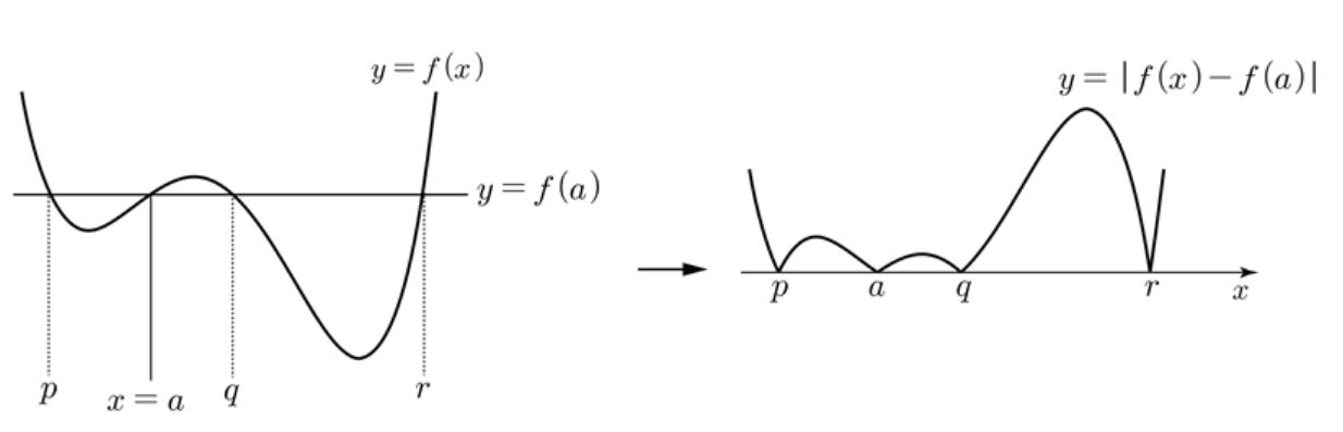 함수 $\left | f(x) - f(a) \right |$ 는 함수 $y=f(x)$ 와 직선 $y=f(a)$ 의 함숫값의 차이를 나타내는 함수이다. 따라서 두 함수가 만나는 교점에서 $y=\left | f(x) - f(a) \right |$ 는 $x$ 축과 만나게 되고 그 점에서 극소가 된다.