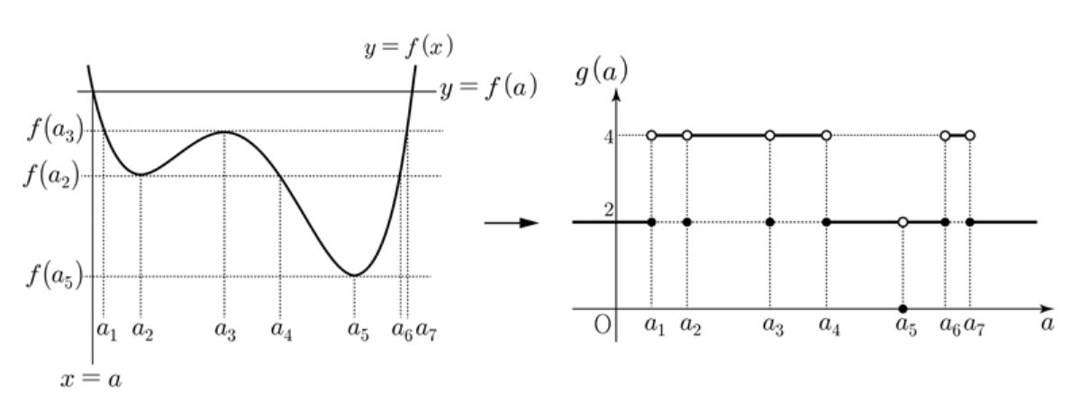 직선 $y=f(a)$ 가 $y=f(x)$의 접선기울기가 0이 되는 점을 지나갈 때 불연속이 된다.